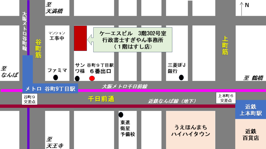 近鉄・大阪上本町駅と地下鉄・谷町9丁目駅を結ぶ地下通路の6番出口から地上に出て頂くとわかりやすいです。